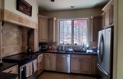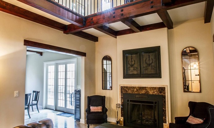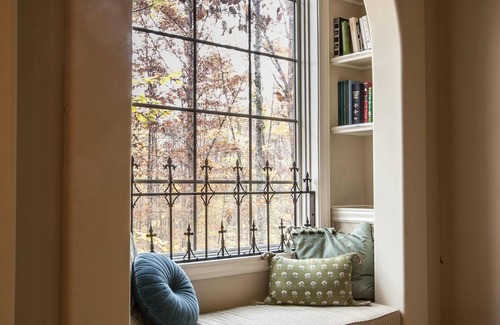 Inside you'll find European luxury design and decor, with specially designed spaces throughout for your next writing project or work from home needs. Cozy up to one of the three fireplaces (one of which happens to be next to the Jacuzzi!) or enjoy working from the patio or deck. A third floor loft with two balconeys offers the perfect place to read, write, bird watch, or practice yoga. Kitchens on the first and second floor, outdoor gas grill, and firepit provide plenty of options for cooking. After visiting the local Monticello Wine Trail wineries, be sure to use the second floor wine fridge to keep your souvenirs at just the right temp. The custom restaurant booth in the breakfast nook, indoor, and outdoor dining areas on the wrap around deck give you an array of dining options to fit your mood.
