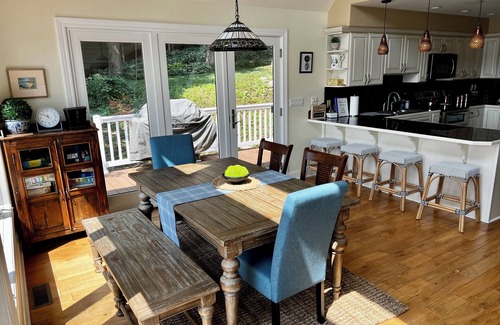 3- level spacious house with AC, with fully equipped kitchen, 4 bedrooms, 5 beds, 4 full baths, 3 living areas, patio and deck and free parking spaces for up to 5 vehicles.