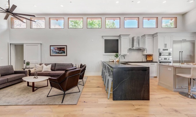 The newly completed Gallery House is fresh and clean. It has lots of natural light with many windows. The home includes 13 large clerestory windows that the architect placed to directly frame the daily sunrise glow on the towering West Temple mountain which rises 4,000 feet above the valley (you have to see the view to appreciate— it is stunning). Extra tall 14-foot ceilings in the great room and kitchen make the home feel open and airy.