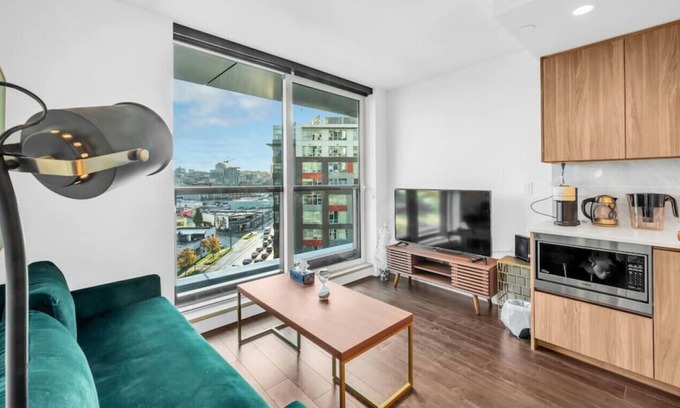 { ABOUT THE ROOM } Cozy 1 regular bedroom and 1 small bedroom, 1 bathroom apartment located on Cook St, close to Science World, Granville Island, Skytrain station , public transport, so you can easily access anywhere in Vancouver. Plenty of restaurants, grocery stores, and fitness centers surrounded. No smoking, No drug, and No parties! { ABOUT THE SPACE } The rooms are equipped with electric heating in winter; The apartment has 24 hours hot water supply, you can take a shower at any time, please note that the hot water is not drinkable, if you want to drink hot water, please boil it by kettle we offered; The interior space is approximately 511 sq.ft; A tiny balcony in bedroom; A queen sized bed in bedroom and a single bed in the den can accommodate up to 3 person; The soundproofing of the room is very good, you can't hear too much noise at night with the windows and doors closed; The building's gate is equipped with the intercom system for allowing food delivery & packages delivery come into the building. { AMENITIES } * Bed Linens, Towels * Air condition&heating * Wheelchair access possible * Free Wireless Internet (WIFI) * One free parking space * Hair Dryer * Body-wash, Shampoo & Conditioner * Toilet paper * Paper towels * Smart TV: Online channels, Netflix, Youtube, Prime video, etc. * Dishwasher * Cookwares & Kitchen Utensils * Oven * Kettle * Microwave * Toaster * Nespresso Coffee maker: free coffee pods * Washer & Dryer { Q&A } * NO Parties, Events allowed; * Quiet hours 10PM-8AM; * Parking space is at underground in the building; * We WELCOME guests who come here for quarantine; * We ACCPET Pets (Dogs/Cats), for guests with pets there is an additional charge of 15CAD/night; * Since we need enough time to clean the room, we set the earliest check-in time at 4PM and latest check-out time at 11AM. If you have early check-in or mid-night check-in request, please contact us; * Due to normal wear and tear and replacement, the furniture shown in the pictures may be subject to minor changes; * Once your booking is confirmed, you will receive an EMAIL asking you to upload some information about your stay and a check-in tutorial will be EMAIL to you; *This unit don't come with a parking space, you can park on street pay parking, $1 per hour. *You are allowed to park in P1 but you will need a stamp from the concierge.