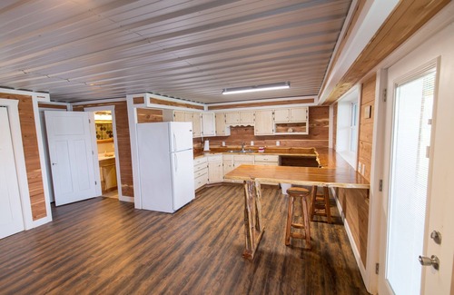 Full size kitchen upstairs furnished with all the basic cooking utensils. If you are cooking for a large group please bring extra or specifics with you. We can not predict what each and every customer will need so we supply the basics and ask you bring the rest. If we stocked the cabinets with everything anyone might need the cabinets would be full, disorganized, and half of it would get stolen over time. Hard plates and dishes provided.