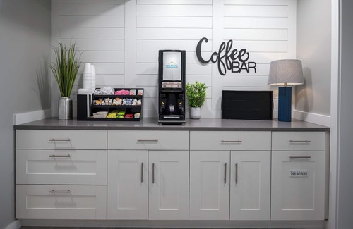 The kitchenette includes a full size refrigerator, dishwasher, microwave, toaster, dishes & utensils, and coffee maker with complimentary coffee. (Please note, there is no stove top or oven.)