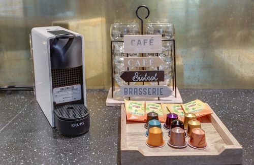 - Open-plan kitchen fully equipped with coffee, sugar and tea capsules
