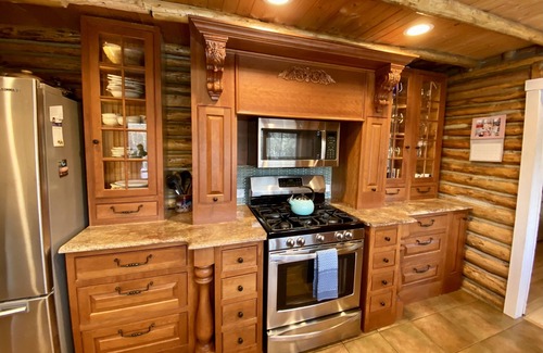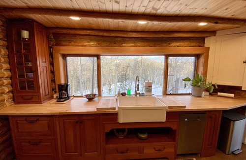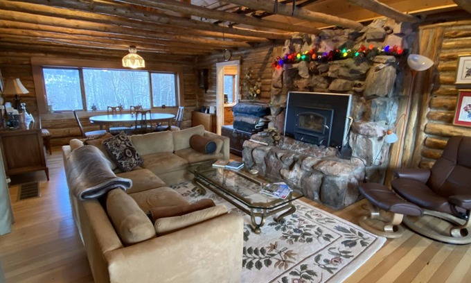 The spacious interior has two separate living areas for spreading out. The main room with fireplace (firewood provided) and the sunroom offer cozy places to gather or relax in solitude. The honeyed 1940's logs throughout the cabin glow with warmth and welcome.