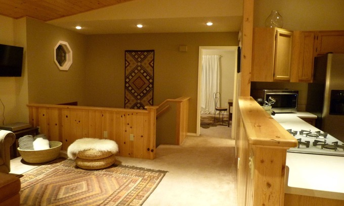 The house occupies the upstairs of a duplex. It has it’s own private parking, entrance, and fenced back yard with double decks. On Sun Mesa Farm we have horses, a donkey, chickens, cats and large friendly dog, all of which are fenced out of your private back yard!
