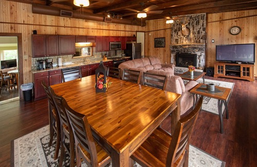 Inside, wood floors, exposed beams, and a gas fireplace with stone surround create a warm lodge-like vibe. Spread out between a living room and the game room where you can concoct a crisp drink at the bar, play a round of pool, or unwind on sofas and watch TV, equipped with DISH.