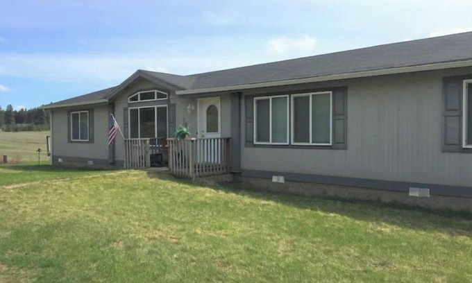 A double wide trailer home located 1mile from 76 & DQ in the town of Goldendale, sets on 10 acre lot with pond. We have 5 koi fish in here, no fishing, no swimming is allowed. No skating during winter month where pond is icy and sleek. Golf cart temporarily unavailable. 3 bedrooms, has 2 queen bed and 1 full bed. Has 2 bathrooms. Entire kitchen is functional, spices, oven, fridge, coffeemaker, toaster, microwave etc. Bar height dining table and chairs seats six people.