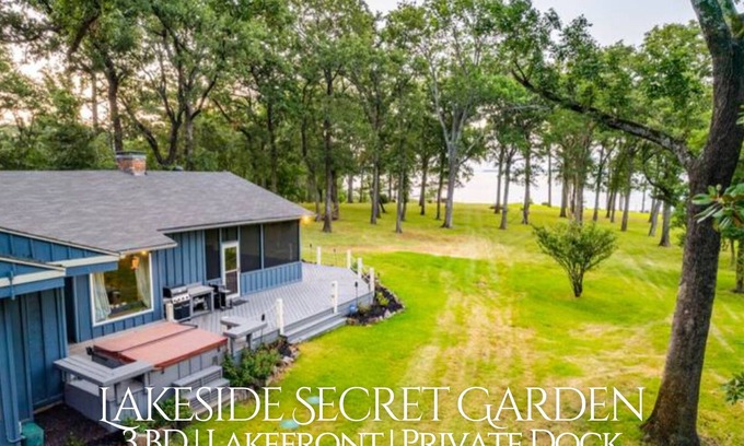 Lakeside Secret Garden is a serene lakefront escape in West Tawakoni, TX, set on nearly three acres of peaceful, tree-lined landscape with sweeping water views. Start your mornings with coffee on the deck as deer quietly wander past, then spend your day soaking up the outdoors—swimming from the private sandy beach, launching from the dock, or unwinding in the built-in hot tub. When the sun sets, gather around the fire pit beneath the twinkle of string lights or relax on the screened-in porch with a good game or meal.