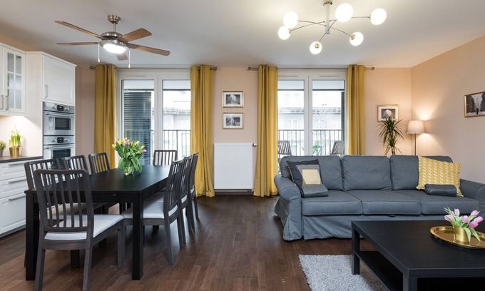 Spacious modern 3 bedroom, 2 bathroom apartment in high standard situated in a modern building, close to Krakow's main attractions. Offering a huge balcony, comfortable lounge area, ceiling fans in all rooms, big dining table and fully equipped kitchen. Located close to the Wistula river, by the shopping mal Galeria Kazimierz, short walk from the Jewish Quarter Kazimierz and the Old Town. Stylish finished with open plan living and kitchen.