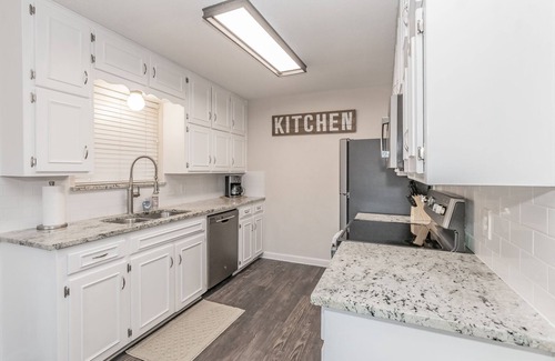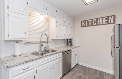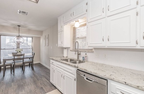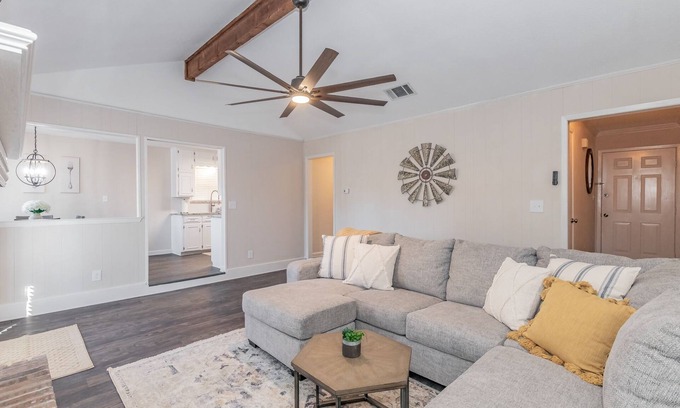 This charming ranch-style 3 bed/2 bath home is located in the heart of Keller. The kitchen comes fully stocked with cookware, dishes, and appliances. Enjoy an open floor plan connecting the kitchen and living room. The primary bedroom features a king bed and ensuite with a walk-in shower. The other two rooms have queen beds and the shared full bathroom off the hallway features a tub/shower combo. There are two smart TVs in the home—one in the living room and one in the primary bedroom. Guests are welcome to use their own streaming app logins, as we do not provide cable or satellite.. A fenced backyard includes a patio with a six-seat table. Walk to nearby Bear Creek Park!