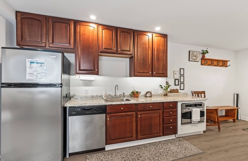 The kitchen includes a full size refrigerator, sink, microwave, dishwasher, slow cooker, Airfryer and Nespresso coffee machine (no stove). You will have coffee and tea available for you, and of course silverware, dishes and glassware.