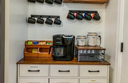 Coffee/tea setup, basic oils & spices, cookware/bakeware, dinnerware