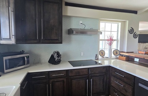 The spacious kitchen features a wooden bar top, brand-new stainless-steel refrigerator and dishwasher, and is fully stocked with dishes, cookware, and utensils for preparing special meals. Amenities include a double oven, electric cooktop, microwave, drip coffee maker, and French press.