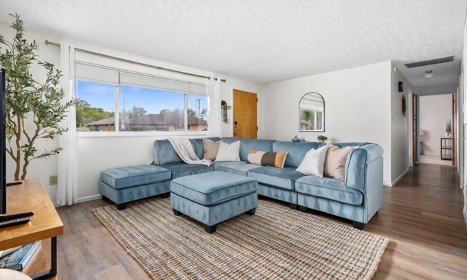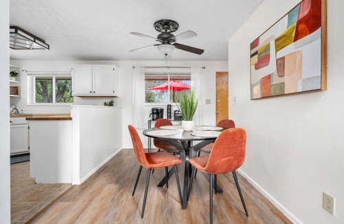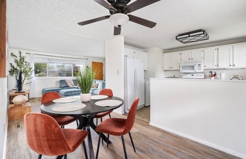 Guests may park on the street, in the driveway, or in the two-car garage. After entering through the front door into the entry space, you'll find a cozy living room with a comfy couch and 50" TV. Past the living room is the large kitchen with a table for four, granite countertops and stainless-steel appliances. A stacked washer and dryer is conveniently set in a laundry closet in the kitchen, with bifold doors for sound control. Off the dining area is the surprise second loving room, for extra space to relax and unwind.