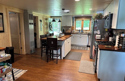 You do NOT have to be way up north to feel like you are. Happy "OURS" Cottage is a year-round 3 bedroom, 2 full bath lake home located on a full recreation 5-lake chain on Morris Lake in Mt Morris, WI. Includes a 4-car tandem garage, a paddle boat, a single kayak, a double kayak, and boat dock with bench. (Separate rental fee for the Pontoon) Enjoy the beautiful summer days on the lake soaking up the sun, boating, skiing, fishing, tubing and making memories of a lifetime with your family. There is an amazing swimming beach a short 5 minute boat ride away that is crystal clear and sandy. This is also the lake that tubing and skiing is allowed. Pack a cooler with beverages and snacks and spend the day tied up to the shore (to the right of the swimming beach) enjoying the lake and sunshine. Sunset pontoon cruises are also a must! The fishing is great right off the dock and boaters fish in front of our cottage all year long. We provide yard games such as bag toss, ladder toss, giant jenga, and bocce ball for your use. The 24' Bennington Pontoon with new 90HP Mercury engine is available for rent Mid April through mid October. 3-7 night pontoon rentals will be available depending on your stay. This is a separate fee from the cottage rental and is NOT included in the cottage pricing. Please email us for pontoon pricing and also let us know when you book the cottage if you are also interested in renting the pontoon. This 4 season home offers winter activities also! Nordic Mountain is only 2 miles down the road if you love to snow ski or snowboard. There is also a tubing hill with lifts next to the ski hill. Maybe you want to snowmobile or ATV on the many trails around the area. And of course... the ice fishing is great right outside our door! You will not want to leave our recently added 4 season room (sunroom) with it's spectacular views of the lake and sunsets. The red leather sectional sofa in the sunroom is very comfy for that unexpected guest. The kitchen was completely renovated in April of 2019. New white shaker cabinets with dark walnut butcher block countertops, new stainless appliances, new flooring, back splash and coffee bar! The master bedroom has a queen bed with an adjustable base- renovated Fall of 2023, as well as the master bath vanity. The front bedroom #2 has a queen bed with newer memory foam mattress with adjustable base and 1 twin X-long memory foam mattress- renovated winter of 2024. BR3 has a queen bed with newer mattress and box spring purchased 2020. A new barn door was installed between bedroom #3 and the Master in December of 2023. All of the beds are newer and very comfy! The living room offers a wood burning stove. Additional amenities include FREE WIFI, 4 TV's with Direct TV, laundry room with HD washer and dryer, new concrete patio off of sunroom- fall of 2023, and 4-car detached tandem garage with bar area behind added Spring of 2023.