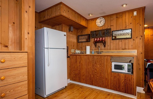 Down the outdoor steps and through the front door, you'll find a light-filled great room and open concept kitchen. In the living room - enjoy spot lights in the vaulted ceiling creating a warm feeling while you relax watching television or watching a movie in a reclining sectional, and glider rocker. There is an electric fireplace to warm your toes. In the dining room - gather your family and friends around the twig-style “Old Hickory” dining table that will easily feed 6 hungry stomachs. In the kitchen – there is a very well equipped kitchen complete with all the major appliances, dishwasher, utensils, pots and pans, standup mixer and blenders and griddle top stove oven and tableware to make your family's favorite meals, or sit back and enjoy a cup of Keurig coffee and take some coffee home in your own "to go cup".