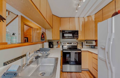 The 3 well-appointed bedrooms are spread across 2 levels. On the main floor, 1 bedroom features a queen bed, closet, and dresser, while a 2nd bedroom with a twin-over-twin bunk bed is great for sharing. Upstairs, the loft bedroom offers a peaceful retreat with a queen bed, office desk/chair, and a comfy 3-person couch. A full bathroom with a tub/shower combo services all bedrooms on the main level.