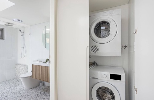 The property boasts a brand new luxury bathroom, complete with modern fixtures and stylish design. Additionally, a separate laundry cupboard houses both a washer and dryer, making it easy to freshen up during your stay.