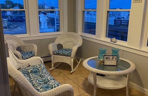 There is 1 full bath+ shower inside the house plus an additional hot/cold enclosed outdoor shower. Ceramic tile and new hardwood throughout. New wall AC unit in the main living room space, plus every room has a ceiling fan (3 bedrooms, kitchen and sunroom have ceiling fans). Sleeps 6-8 guests. Enjoy sunrise and sunset in the bright sun room that overlooks the ocean across the street and listen to the waves crash from our spacious front porch which is perfect for gatherings. The spacious yard offers a large picnic area with a family-size Weber BBQ grill and picnic tables for your enjoyment.