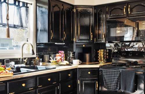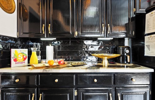 *SLEEK BLACK CABINETRY – A stylish contrast to the vintage decor.