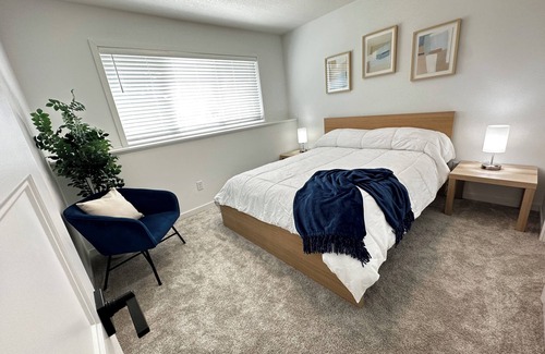 Newer custom built 2,900 square foot Modern 3 bedroom, 4 bathroom home. (Our home has 4 bedrooms total but one bedroom will be locked and inaccessible during your stay). Two bedrooms upstairs have King beds and professionally installed blinds for privacy, both with ceiling fans. Home has central air conditioning with a Nest smart thermostat. The downstairs bedroom has a Queen bed and is cool and comfortable. The downstairs also has a nice family room with 65" OLED LG TV with all streaming services and an electric fireplace and a huge Room & Board Comfy Sectional.