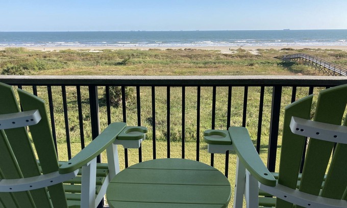 Our wonderful piece of paradise is a 3rd floor condo located on the east end of Galveston, at Islander East. It is a wonderfully decorated, beachfront, studio condo with an unobstructed view of the Gulf of Mexico. You will be able to enjoy this wonderful view while sitting in 2 tall high-back chairs, so as to see over the railing, with a table in the middle. Enjoy your morning coffee or evening wine or drink while watching the waves crash right in front of you. The beach is just a few steps away, across the private footbridge and over the dunes.
