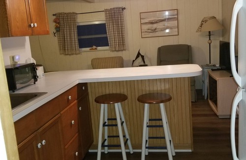 Kitchen with breakfast counter. Pots & pans, coffee maker, toaster, microwave provided.