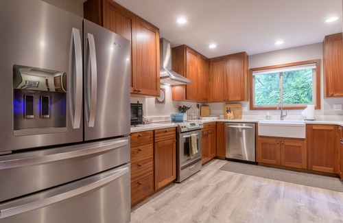 well-appointed kitchen with mahogany cabinets and farm sink. Enjoy