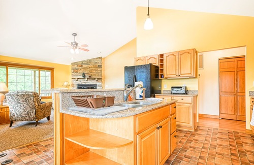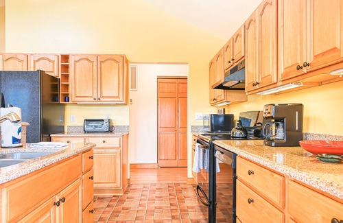 The spacious, three-bedroom interior comes well-appointed for comfort with a cozy living area and a separate den with sofa, armchair, and smart TV for casual family lounging. (The fireplace is not operational.) The full kitchen comes equipped for home cooking with plenty of counter space, cookware, and major appliances and the sunny dining area can accommodate up to eight for sit-down meals. While still a work-in-progress, the basement sets the stage for at-home entertainment with foosball, darts, and a card table.
