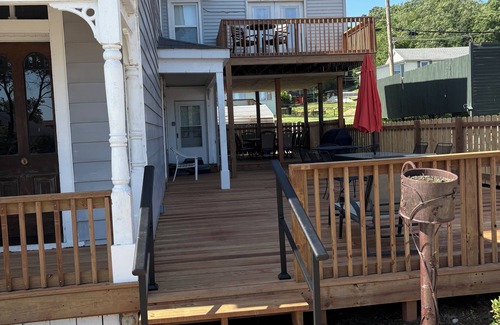 Make yourself at home in this 4-bedroom 3 bathroom large historic house. The house sleeps up to 16 people. It has 3 king beds, 3 queens and two pull out double beds. It has a brand new, very large outdoor patio with seating for 18, a table top fire pit and a barbecue grill. There is a full kitchen upstairs and a family room. A small kitchenette downstairs and a family room.