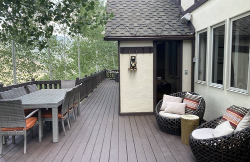 Our 4,100 square foot half-duplex is located high on a beautiful hillside in West Vail just above Donovan Park is the perfect place for both family-friendly or adventurous groups. 3 distinctive levels offer a unique floor-plan with 4 bedrooms plus a large loft with 4 1/2 bathrooms that allows groups to both spread out and come together all at the same time. A massive dining and great room combine with sprawling windows and cathedral ceilings, designer furniture, fireplace and a 65" HD TV/entertainment system. Find a book or a tap a beer in the inspiring library with built-in kegerator! Relax or play games in the basement in the media/game room with 55" TV and fireplace. Let the kids frolic in the the 'KIDS ONLY' playfort! Enjoy breakfast in the kitchen at the custom banquette. Step outside to a massive wrap-around deck with mountain views that's perfect for apres ski, sunsets, and star gazing and includes a 7-person sunken-deck hot tub, a classic, all-cedar sauna/bathhouse, outdoor speakers, and gas barbecue - all surrounded by mature Aspen trees.