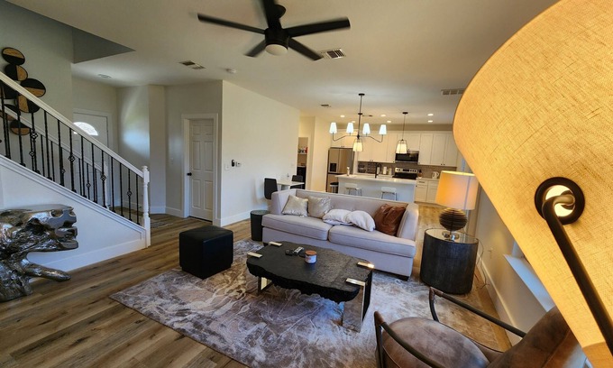 Minimalist home in a great location. Tesla, COTA, and Airport are all less than 9mins away. Downtown Austin is 18mins away.