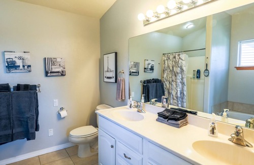 Enjoy this entire home, with 4 bedrooms (King master upstairs, 2 queens and one full - twin bunk bed down stairs). Sweeping mountain views from upper level deck. Six person hot tub in huge back yard, 3 hole Frisbee golf course and Cornhole game.