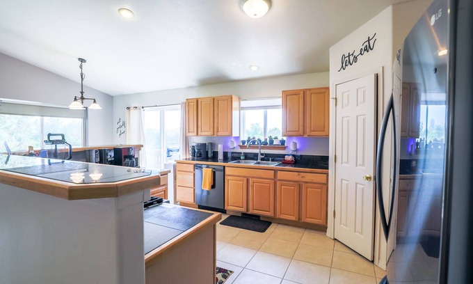 Kitchen is fully stocked with all cooking utensils for your meals at home. some examples; Ninja blender, waffle iron, crock pot, Kuerig, Mr. Coffee and grinder. Upper level has walk out deck with propane grill. there is a 2nd grill downstairs in the back yard also.