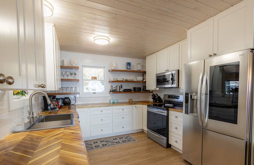 The kitchen is fully equipped with a new LG door in door french door refrigerator, induction cooktop stove with airfry oven. New Dishwasher (no hand washing at this lake home!)