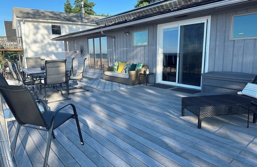 Beautiful home with unbeatable location! House is lake front and surrounded by sandy beach. Walk out the door and right to the water. On the road side is a very private and serene terraced gardens. Irondequoit bay and a public boat launch is right across the street. The bay is perfect for boating skiing, kayaking/canoeing fishing, etc. Seabreeze amusement park is right down the street. There are four bedrooms and two full baths, with a day bed in the common space downstairs! House has beach chairs and beach toys provided, as well as all linens included! Fire pit on beach side for renter use, but renter must provide wood.
