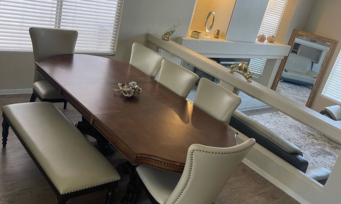 4 Bedroom Home w/Pool 8 minsfrom Allegiant Stadium has 4 Bedrooms , 3 Bathrooms, and max occupancy of 9 people. The minimum rental for this property is 1 nights, but this can change depending on the season you plan on staying. Previous guests have given good rated it, and VRBO labeled it a top-rated House because of the excellent services rendered by the owner or manager of this House, and has consistently provided great experiences for their guests. Most families or guests that use it recommend it to their friends and some of them are repeat guests. House has a friendly neighborhood, and the Silverado Ranch has interesting places to visit. If you want to learn more about the House in Silverado Ranch, such as places to visit and things to do nearby, you can check below to learn more.