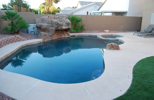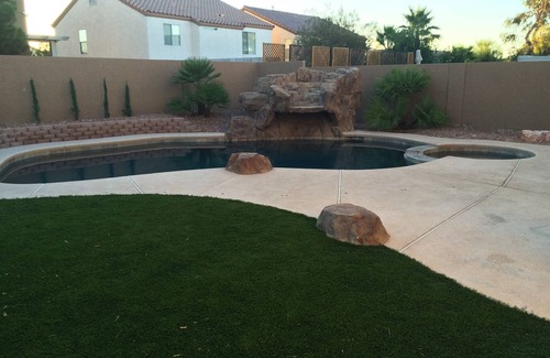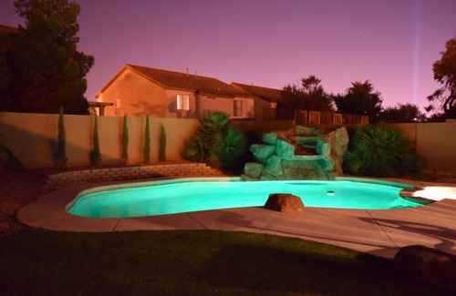 4 bedroom 1800+ square feet located on the south side of Las Vegas 10 minutes from the strip. This house is perfect for a family getaway. The spacious backyard is professionally landscaped with newly updated pool and spa with pebble tec. The pool can be heated at an additional charge that varies on time of year. It has remote control for led pool lights waterfall and spa to set the mood for relaxation.