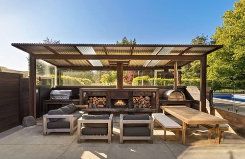 Outside, this home really starts to sparkle. A large open fireplace, flanked by a BBQ and pizza oven line one side with a lounge area and dining table making up the outdoor entertainment pit - we're picturing an evening next to the fireplace, a glass of local pinot in hand, as you enjoy a BBQ with the family. A seasonally heated swimming pool (warm months only) is perfect for adults and children alike, and the spa pool offers a relaxing spot to retreat to at the end of the day. Beautifully manicured gardens offer a spacious play area for children to burn off some energy in the fresh mountain air, and an oasis of greenery.