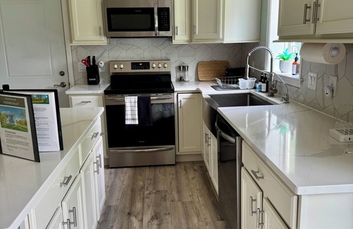This 4-bedroom house in Saugerties is perfect for your escape. With 1 king bed, 1 queen bed, 1 bunk bed, and 4 twin beds, there's plenty of space for everyone. Our kitchen is fully stocked and our bathrooms have everything you need. Enjoy the enchanting atmosphere of this terrific property, complete with a pond view, grill, hot tub, large yard and outdoor seating. We hope you'll enjoy your stay at our house.