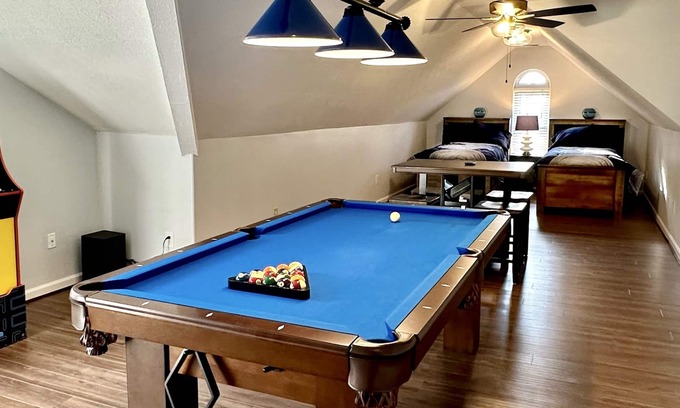 Indulge in ultimate comfort at this spacious 4-bedroom house. Each room boasts two twin-size beds. The largest room doubles as a bedroom and game room, complete with a pool table and card table. Enjoy entertainment on large flat-screen Smart TVs with fast WiFi throughout. Step outside to a fenced yard with a patio, BBQ grill, gazebo, and outdoor dining for eight. Nestled in a family-oriented neighborhood, just 7 miles from the Horse Park and 4 miles from downtown.