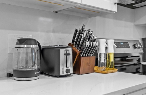 - Fully equipped kitchen with pots/pans, toaster, microwave, oven, coffee machine, coffee, kitchen knives, bakeware, dinnerware, coffee mugs, wine glasses, cooking utensils, kettle, tea, basic condiments, and more!