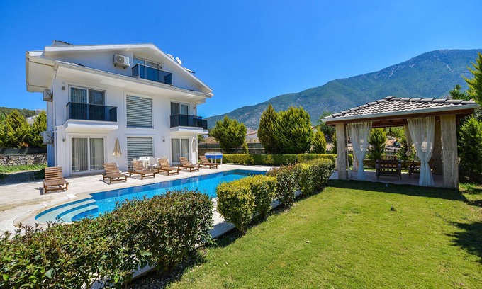 The villa is located in the Ovacık area of Fethiye. Villa has 4 bedrooms and 3 bathrooms which could easily host up to 8 guest. Two of the bedrooms are equipeed with private bathroom. The villa is located in the beautiful nature of Ovacik, The villa has huge garden and in the garden there is private swimming pool. There is also modern designed kitchen in the villa where you can cook delicious meals. Have no doubt our fully equipped villa will provide you totally relaxed holiday experience! From villa via car you can access to Ölüdeniz in 5 munities, Fethiye in 10 munites, and Dalaman 45 munites. The villa is within walking distance of bars, restaurants and city center. The villa has free wi-fi and barbeque. Villa is also secured with CCTV and alarm system.