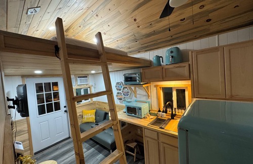 Perfect tiny home nestled between Flagstaff and the Grand Canyon. This home has 3 lofted sleeping spaces, and a private downstairs room; the sofa also converts to a large twin bed - allowing this tiny home to comfortably sleep up to 8.