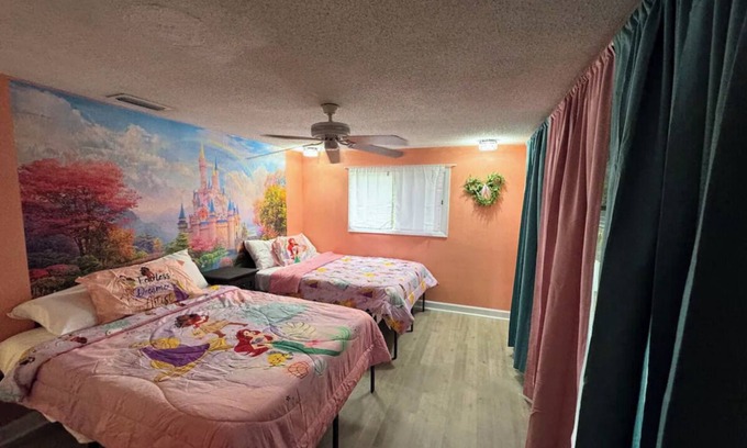 Stay comfortably in Orlando at this 4-bedroom villa. This enchanting property is perfect for families or groups of friends. Our themed rooms add a special touch to your vacation. Enjoy the convenience of amenities like WiFi, smart tvs, a washing machine/dryer, and central air/heating. We invite you to enjoy the beautiful screen covered, newly redone pool area. Wind down after hours in the game room, with a museum-like touch. Make memories, kickback, relax, and enjoy everything Orlando and our villa has to offer.