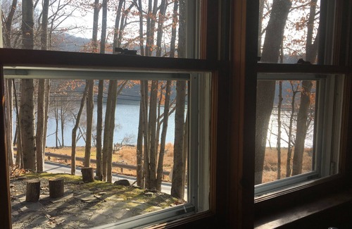 construction. The cabin is located on a slope under a canopy of mature beech, maple and oak hardwood trees, affording shade and wonderful views of Lake Wallenpaupack, located only 200’ from the front door.