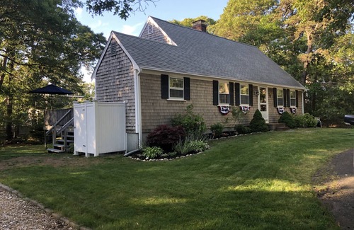 Peaceful, private 4 BR, 3 BA (sleeps 10 comfortably, up to 12) south of Rte 28 at the end of a dead-end road abutting conservation forest with pond access and views from deck of large Skinequit Pond: great for swimming, paddle boarding or kayaking (use of our paddle board, kayak and canoe included). Walk, bike or car to Red River Beach (less than 1/2 mile from our home) one of Harwich's finest beaches with plenty of parking, bathrooms and a food. truck. 3 finished floors of living space. Central air, awesome large, sun-filled outdoor shower and large deck. Fire pit patio area. High speed internet, HDTV cable, gas grill, washer & dryer. CC Bike Trail is a 10 min. bike ride away. 5 min. drive to downtown Harwichport, 10 min. drive to downtown Chatham.