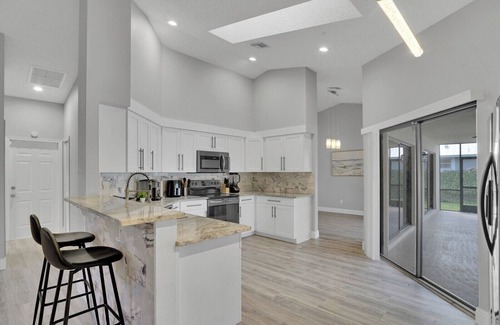 Discover Bright and spacious (over 2,200 sq ft) beautifully furnished 4/2 with Heated Pool home available in sought after Sugar Pond in Wellington! Just a short golf cart ride to WEF, close to Starbucks, Dunkin, brand new Publix and multiple restaurants and shopping within a mile. Relaxing Pool & Spacious Outdoor area with screened patio - Perfect for unwinding after a long day! Fully remodeled with gorgeous fully stocked kitchen, 4 good sized bedrooms with a split floor plan for privacy, crisp quality cotton linens. 2 car garage and large driveway. Enjoy amenities like WiFi, AC, heating, and a washing & dryer. It's easy to see why you'll be able to unwind at our place!