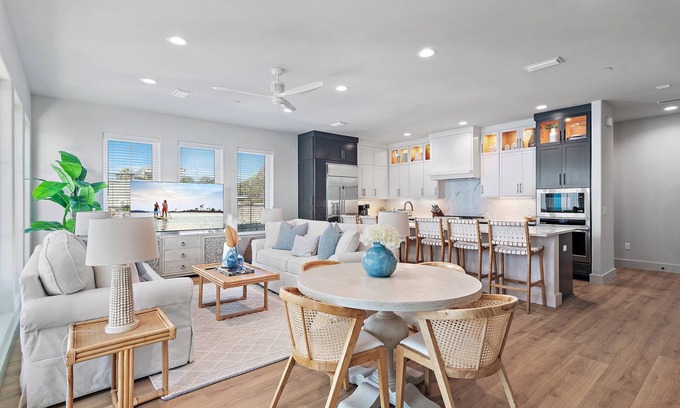 Living Area: Step into a spacious and elegantly decorated living room with comfortable seating, a large flat-screen TV, and plenty of natural light. The open floor plan seamlessly connects the living area to the dining space and kitchen, creating an ideal environment for family gatherings and entertaining.