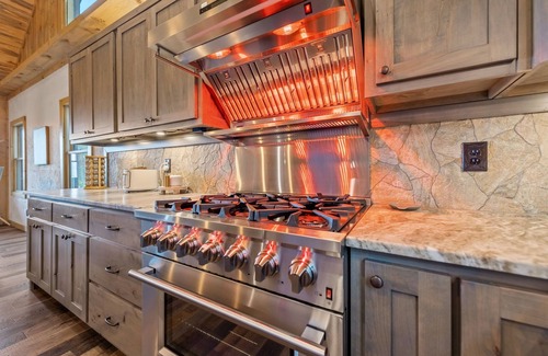 The kitchen will blow you away. The beautiful copper sink and natural stone backsplash brings out the best of the mountains! With high-end Forno appliances, the oven even includes heating lamps. Seating for 6 at dining table + 3 bar stools at the island (extra foldable chairs in closet)